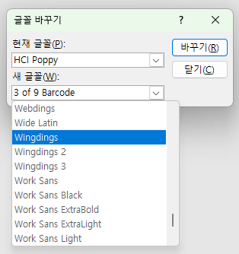 새 글꼴(B)을 골라주면, 파일 내에 있는 A 글꼴을 모두 B로 바꿔준다.