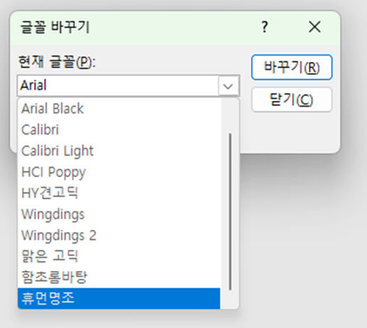 위와 같이 '글꼴 바꾸기' 메뉴가 나타난다. (뭐 이렇게 숨겨놨냐고...)