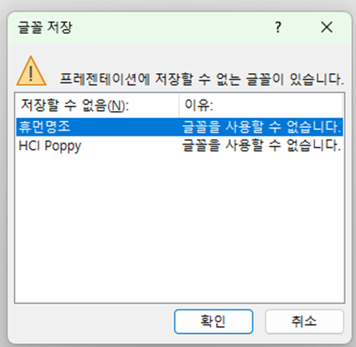 바로 요 놈.... 프레젠테이션에 저장할 수 없는 글꼴이 있습니다..