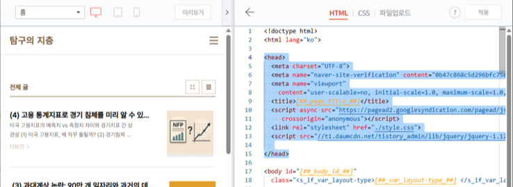 창 오른쪽에 내 블로그의 html 코드를 보여주는데요.
